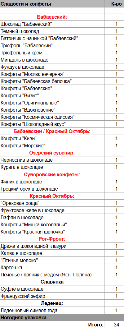 Кол-во сладостей: 34 шт.
