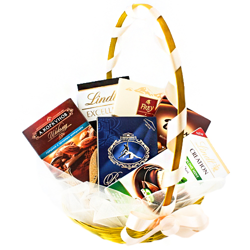Состав: корзина, декор, Шоколад Lindt темный со вкусом мяты и какао,Шоколад Frey горький со вкусом лимона и перца, Шоколад Lindt горький с морской солью, шоколад Вдохновение, Шоколад Коркунов горький с миндалем, Шоколад DOVE молочный с фундуком.