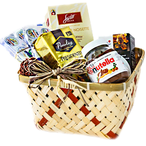 Состав: лукошко, кофе молотый Президент, сливки 10% президент, сахар крупный карамельный, печенье, паста шоколадная, 2 чашки кофейных с блюдцами, декор