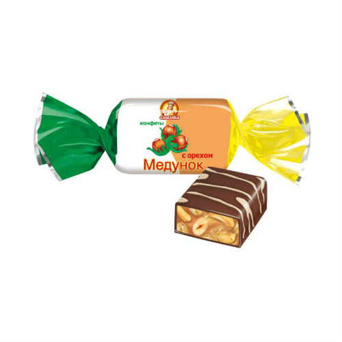 Конфеты Медунок с орехом производства фабрики Славянка можно купить оптом с доставкой по Москве, Подмосковью и ЦФО. Низкая цена обусловлена отсутствием посредников при наличии прямого договора с производителем.  Все актуальные сертификаты в наличии. Минимальный заказ: 1 коробка