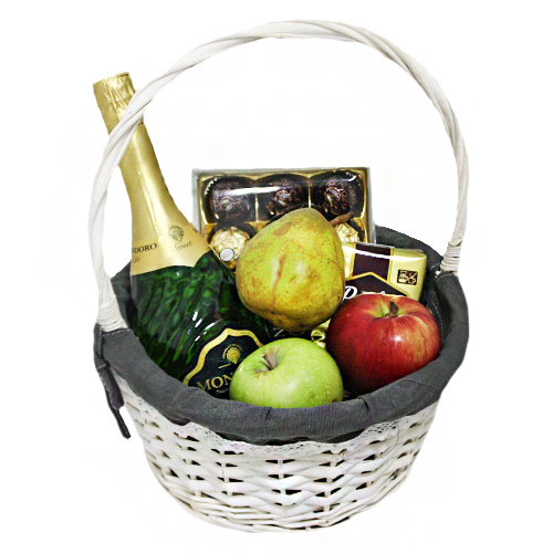 Состав : Корзина, вино MONDORO Asti, конфеты Ferrero Collection 172 гр, кофе Presidento, яблоко 2 шт, груша 1 шт