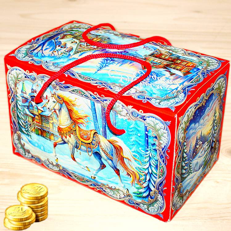 Сладкий новогодний подарок в виде шкатулки от фабрики Красный Октябрь в Радумле