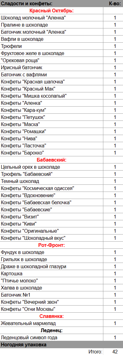 Кол-во сладостей: 42 шт.