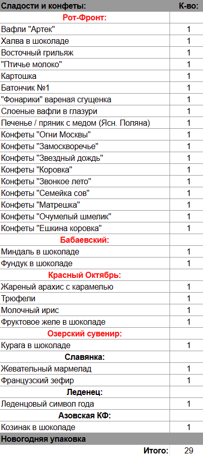 Кол-во сладостей: 29 шт.